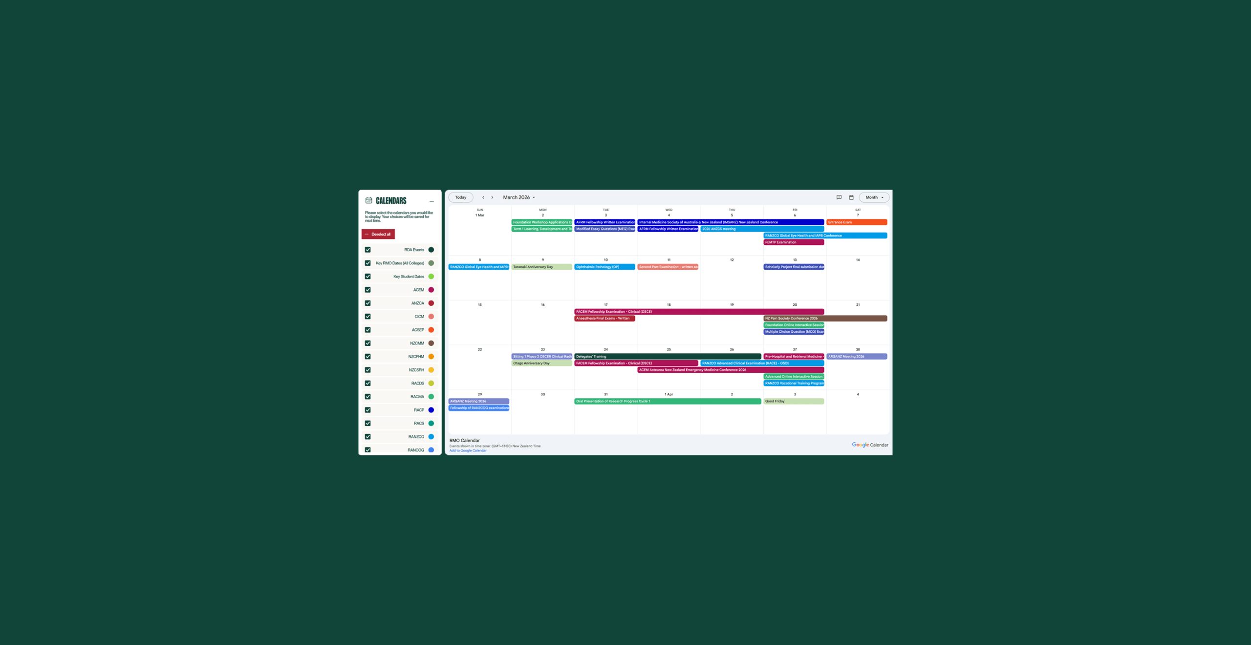 Earlier this year the we created a centralised RMO calendar, bringing together important dates including changeover periods, College exam dates and application deadlines, as well as conferences and other general events that are relevant to all RMOs.